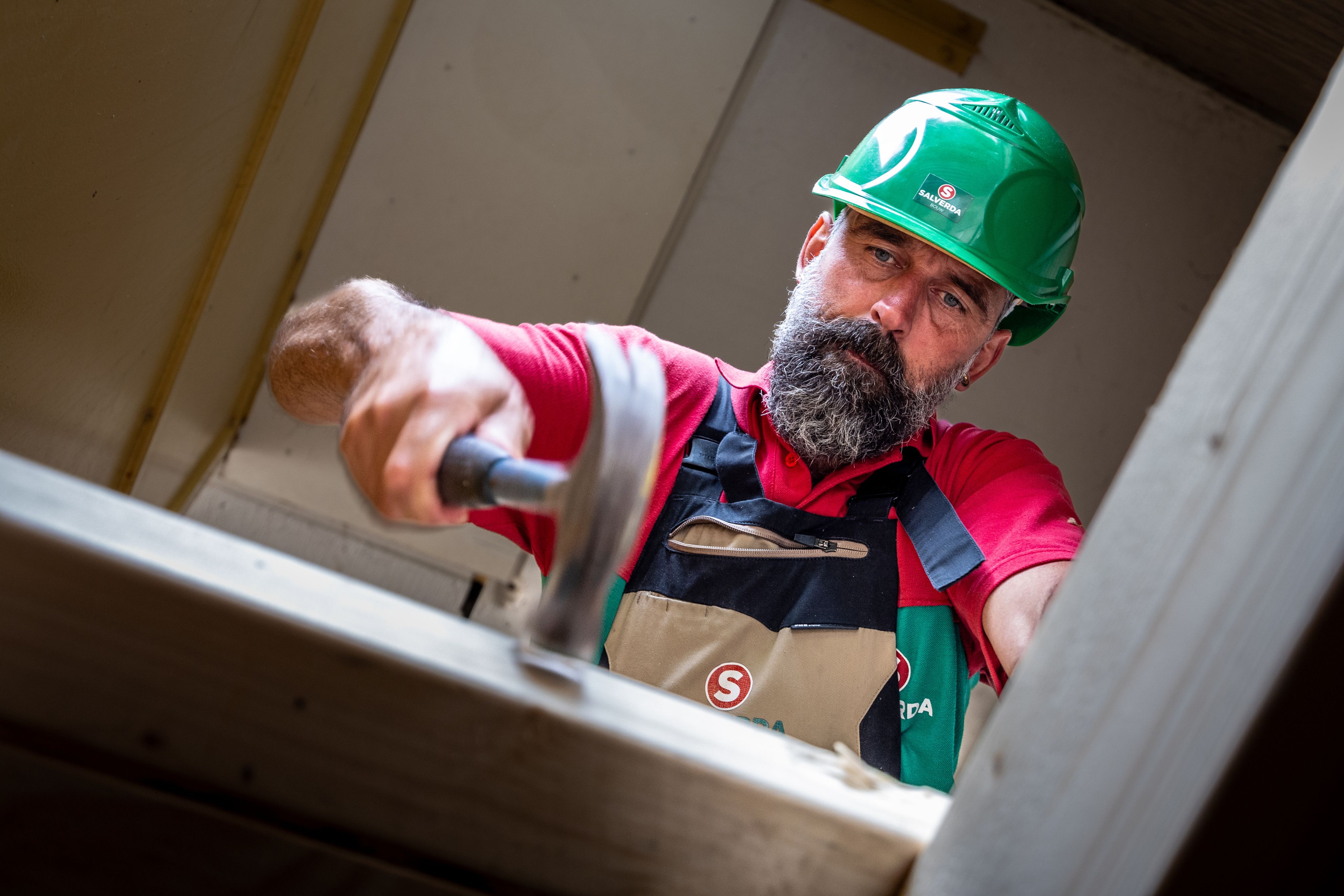 Evert had nooit de ambitie om timmerman te worden, maar hij is simpelweg het vak ingerold. “Ik heb het wel van huis uit meegekregen. Mijn broers zijn ook timmerman geworden.” Direct vanuit school is hij aan het werk gegaan. Inmiddels werkt hij al bijna 25 jaar als timmerman. Zijn werkzaamheden lopen flink uiteen. “Van fundering maken tot het aftimmeren en alles wat daartussen zit.” In het werkveld heeft hij het meeste geleerd. “Je kunt jezelf ook niet direct timmerman noemen. In de praktijk wordt je het meeste bijgebracht.”